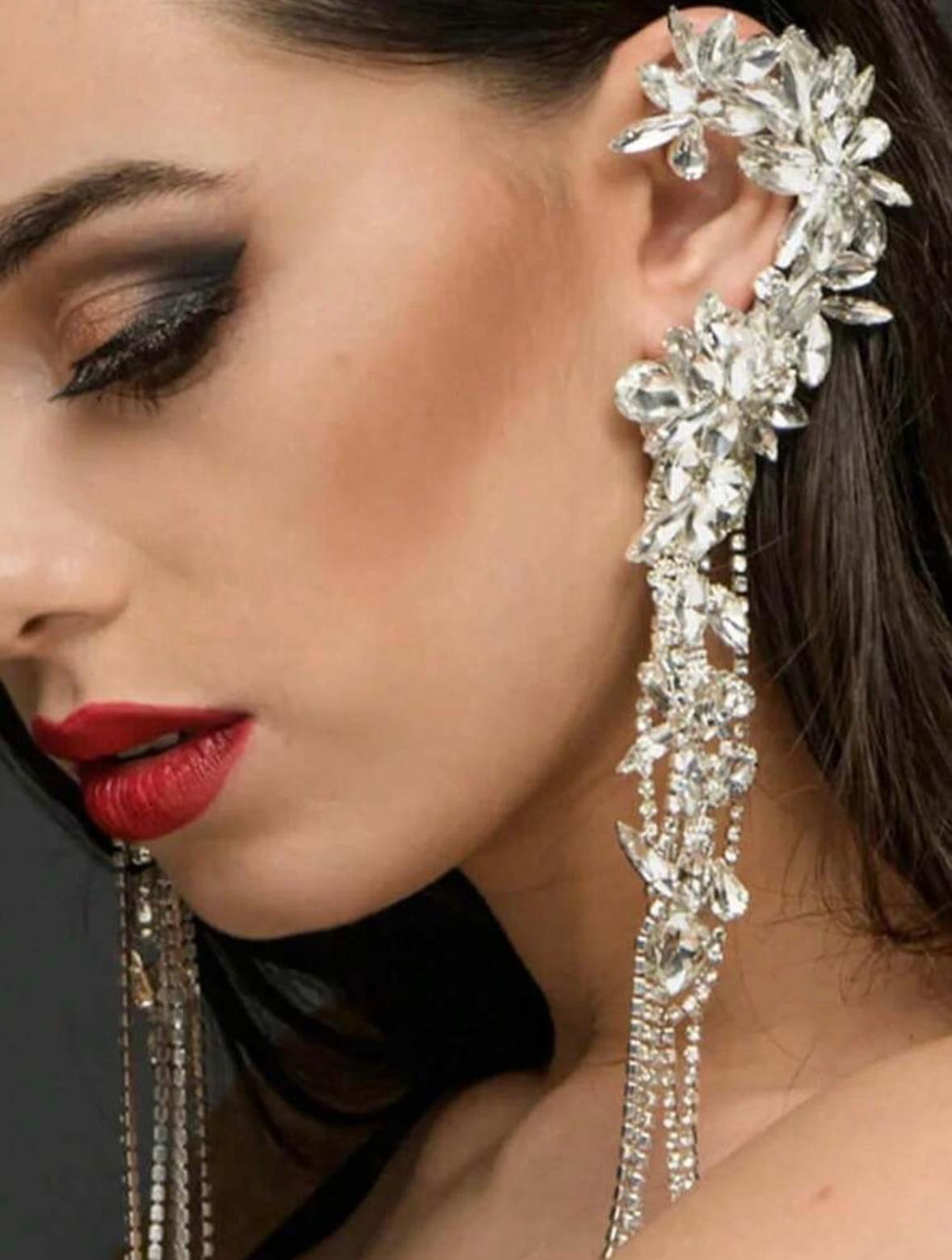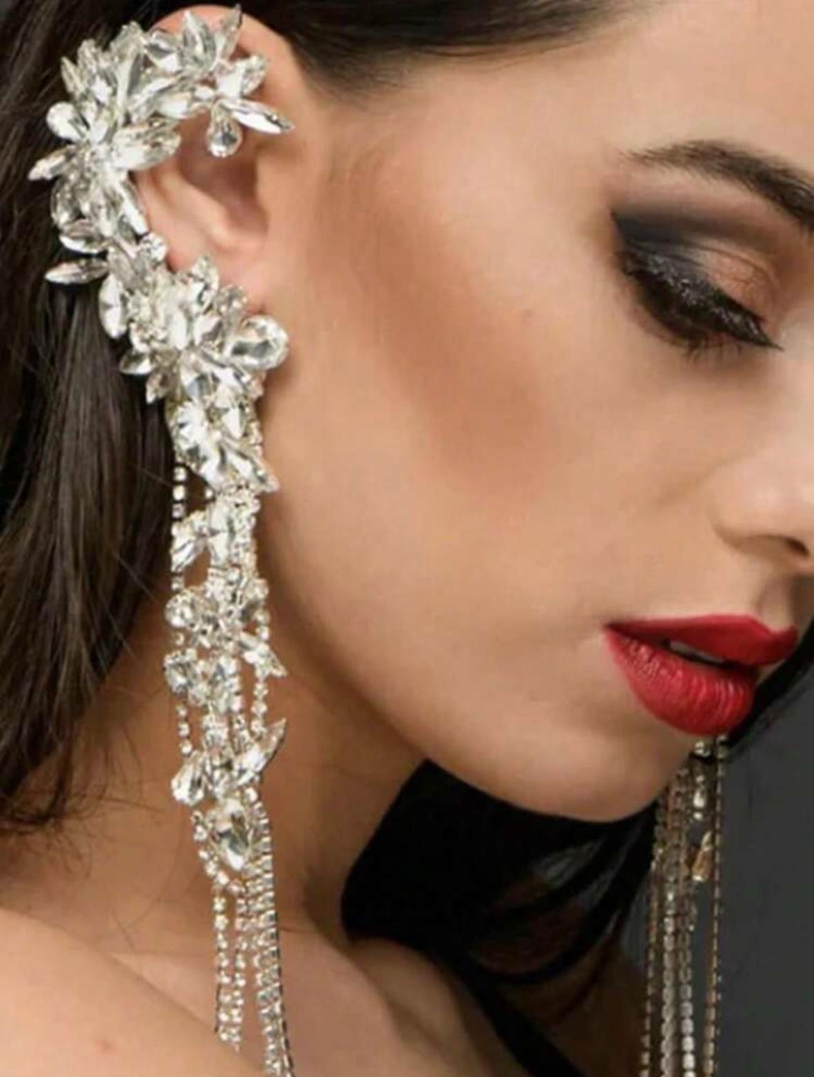 De fonkelende kristallen vormen bloemrijke accenten die elegant langs je oor vallen, terwijl de lange glinsterende kettingen een luxueuze en dramatische touch toevoegen.
